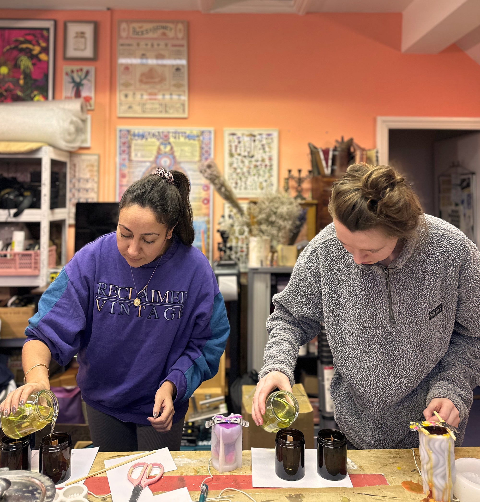 Yep! Every single one! I fell in love with the craft of candle making a decade ago. All of our candles are crafted with care in our Wax Atelier, located right above our honey and beeswax processing studio. Each creation is designed by me and infused with inspiration from Mama Earth. From psychedelic rainbow mushrooms to funky tie-dye wavy pillars, we love playing with wax alchemy. Each candle is hand poured and individually coloured using a specific technique, making each piece unique in its design.